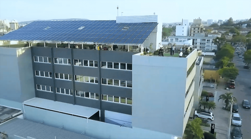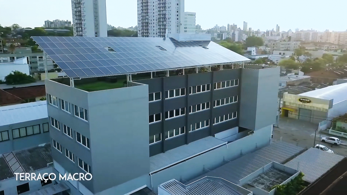 Em nossa sede, instalamos uma usina solar fotovoltaica de 63,24 kWp (On-grid). Esse projeto é composto por 186 placas solares de 340W, do tipo BIPV (Building Integrated Photovoltaics), ou seja, os módulos solares são incorporados à estrutura predial, servindo também como cobertura. Todas as lâmpadas são LED, o que resulta em uma economia de até 60% no consumo de iluminação.